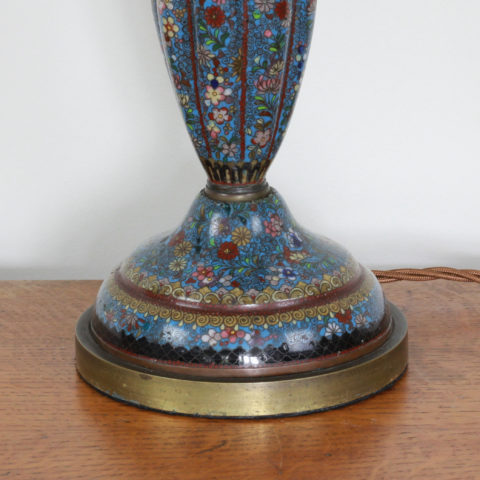 A 19th century turquoise glass column table lamp, with a gilt bras tripod base and white hand painted design on the column. Fitted with brown silk flex, amp plug and switch on lamp. Shown with 17″ shade. Shade not included. Condition: general slight wear appropriate with age.