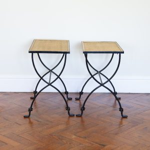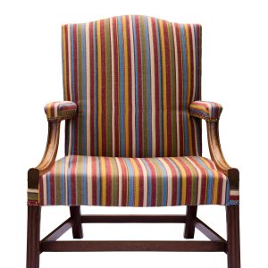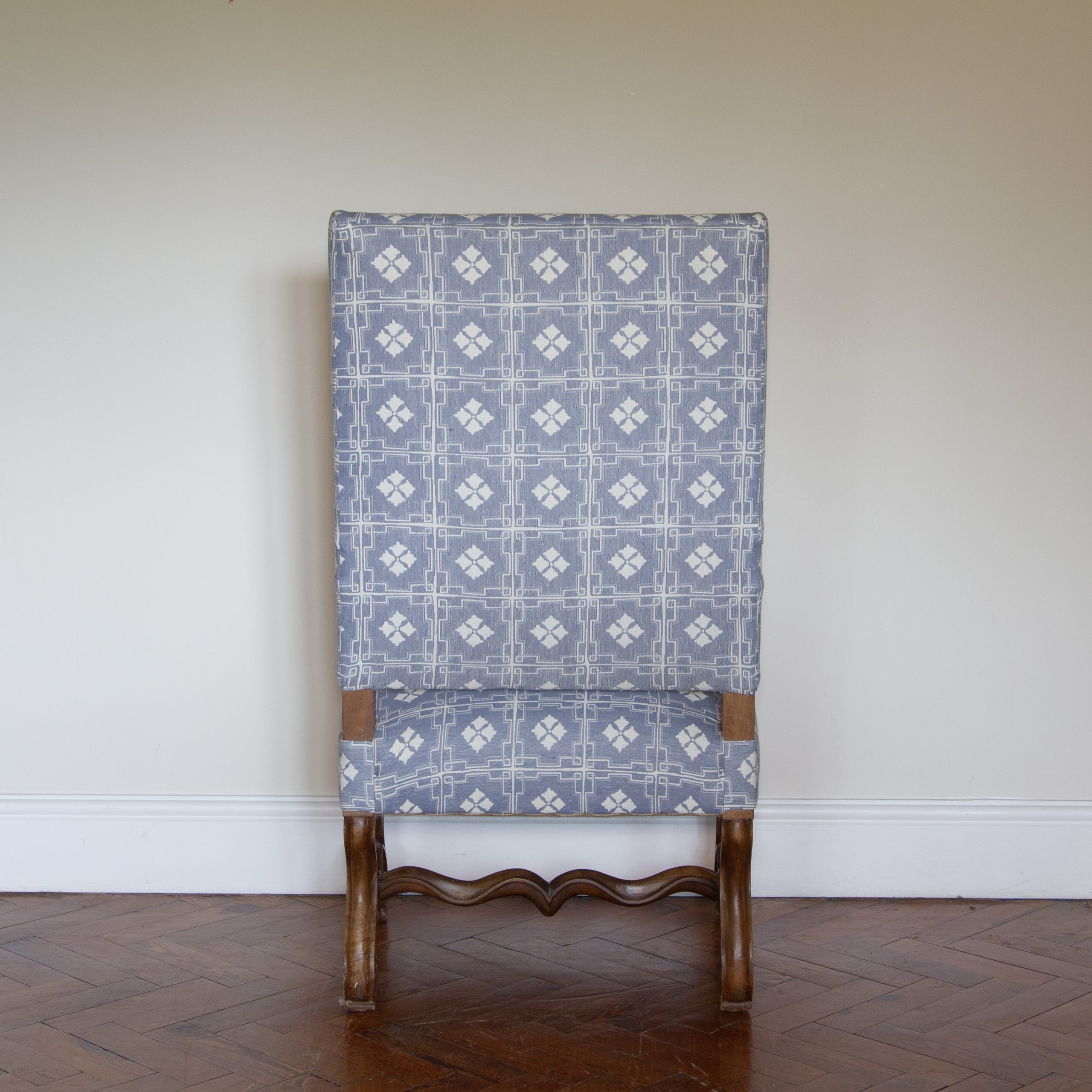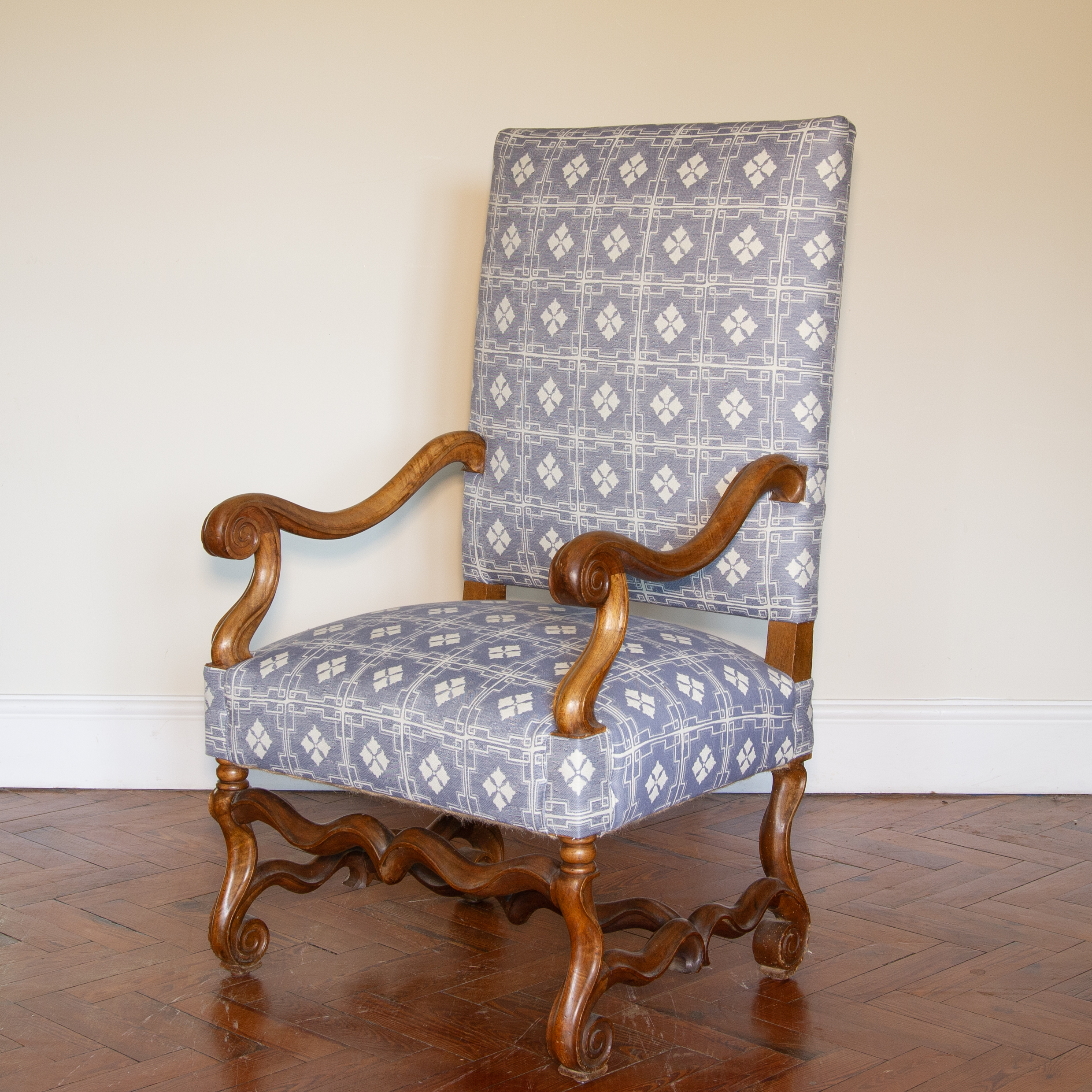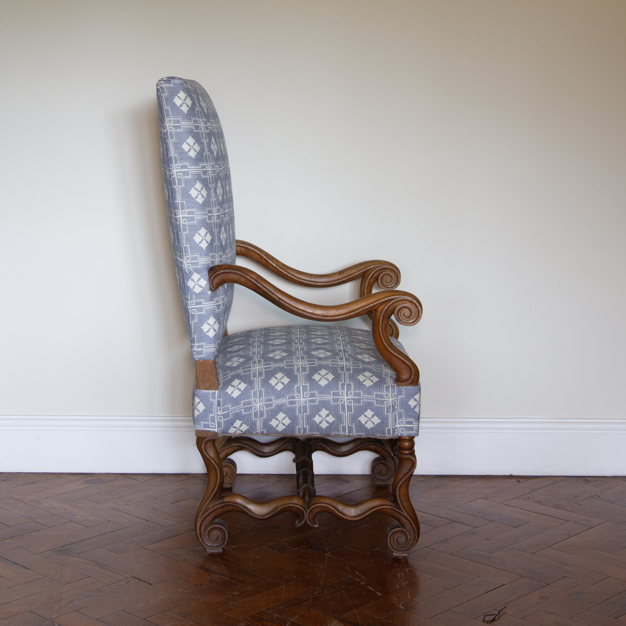 A single Carolean style walnut open arm chair upholstered in our own Felix – Blue fabric.